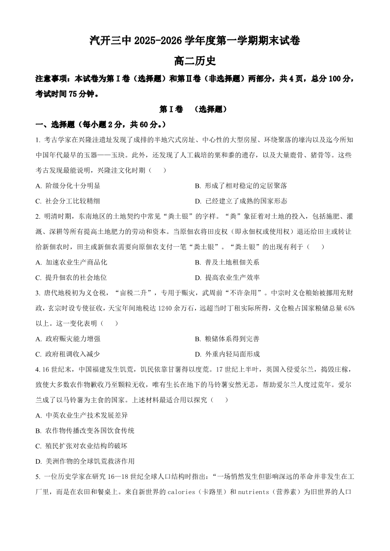 吉林省长春市长春汽开三中2025-2026学年高二上学期期末考试 历史试题(含答案).pdf