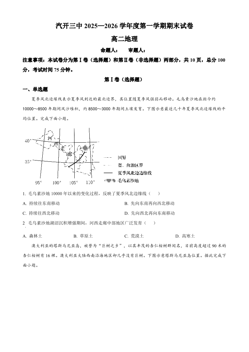 吉林省长春市长春汽开三中2025-2026学年高二上学期期末考试 地理试题(含答案).pdf