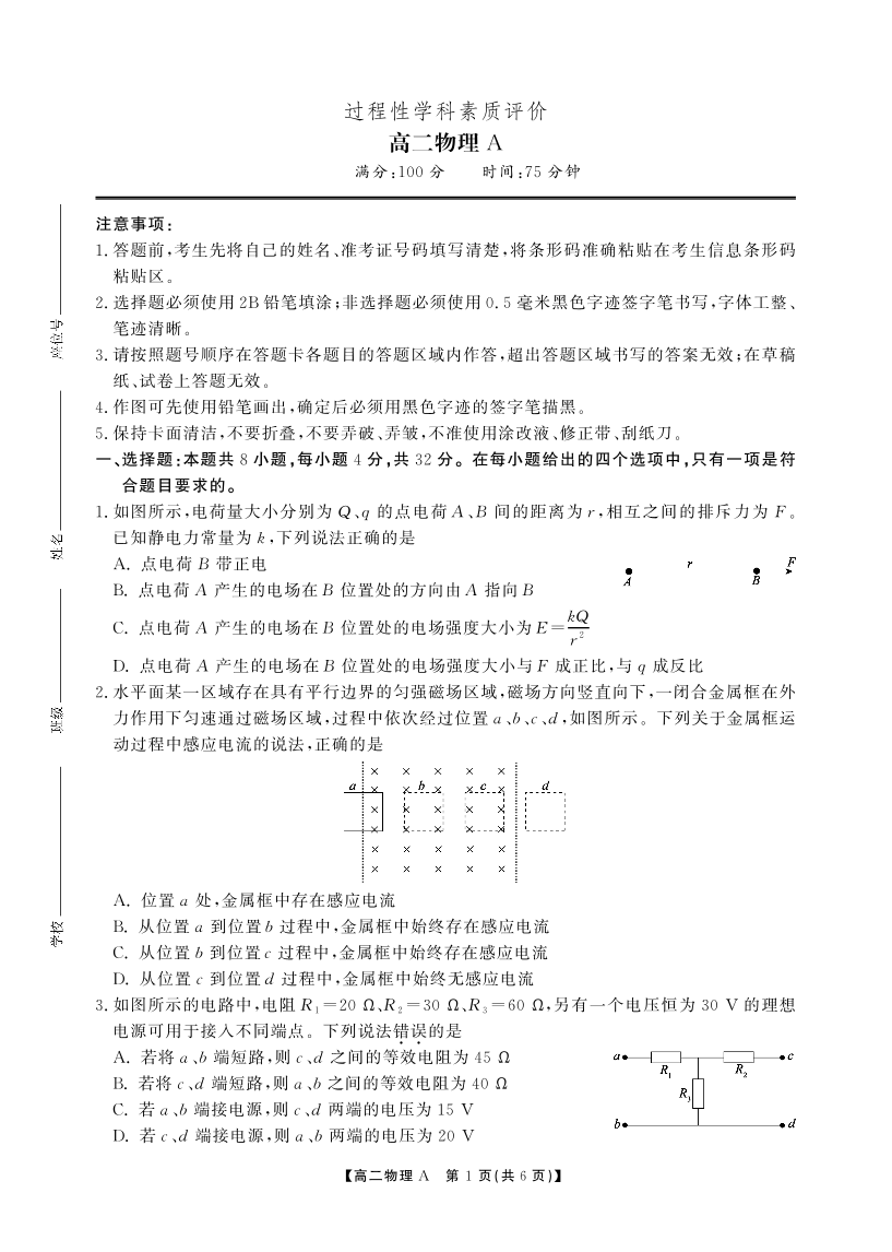 安徽省鼎尖联考2025-2026学年高二上学期过程性学科素质评价 物理A卷.pdf