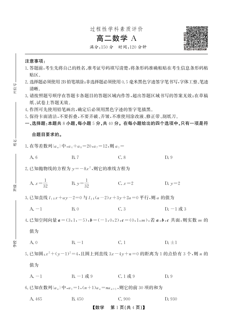 安徽省鼎尖联考2025-2026学年高二上学期过程性学科素质评价 数学A卷.pdf