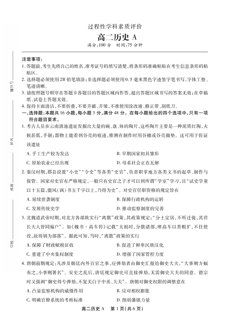 安徽省鼎尖联考2025-2026学年高二上学期过程性学科素质评价 历史A卷.pdf