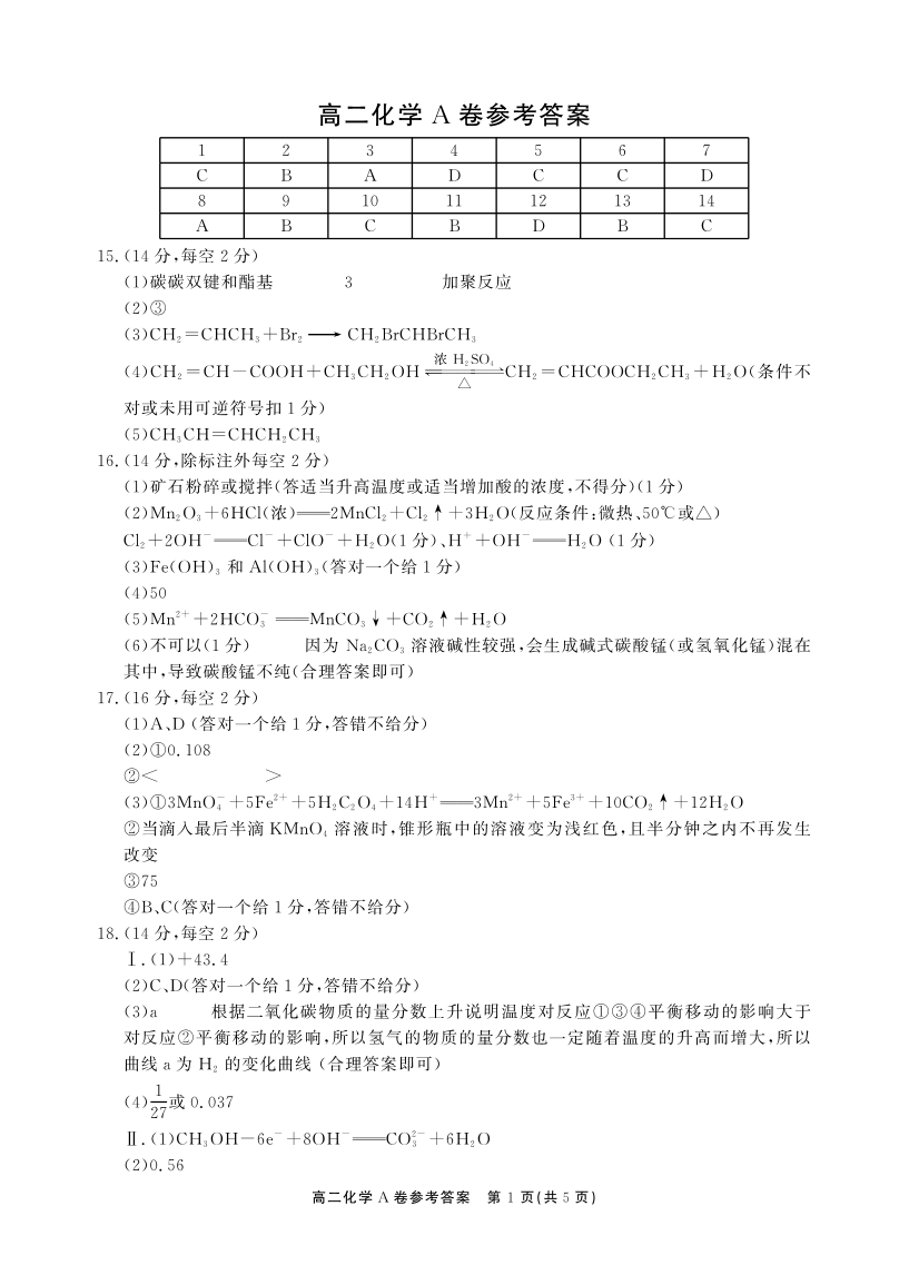 安徽省鼎尖联考2025-2026学年高二上学期过程性学科素质评价 化学A卷答案.pdf