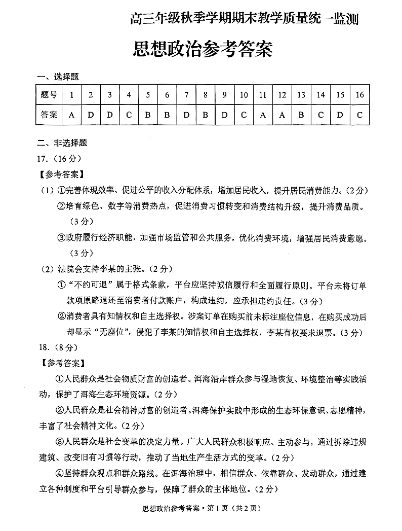 云南德宏傣族景颇族自治州2025年高三年级秋季学期期末教学质量统一监测 政治答案.pdf