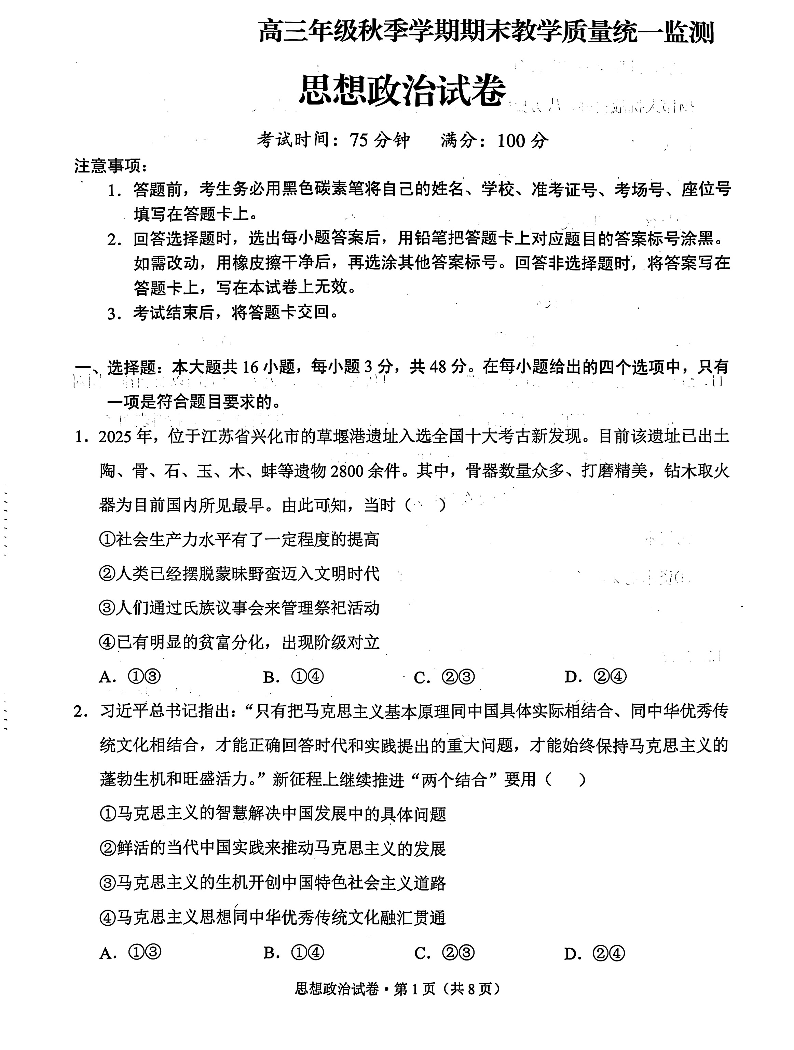 云南德宏傣族景颇族自治州2025年高三年级秋季学期期末教学质量统一监测 政治.pdf