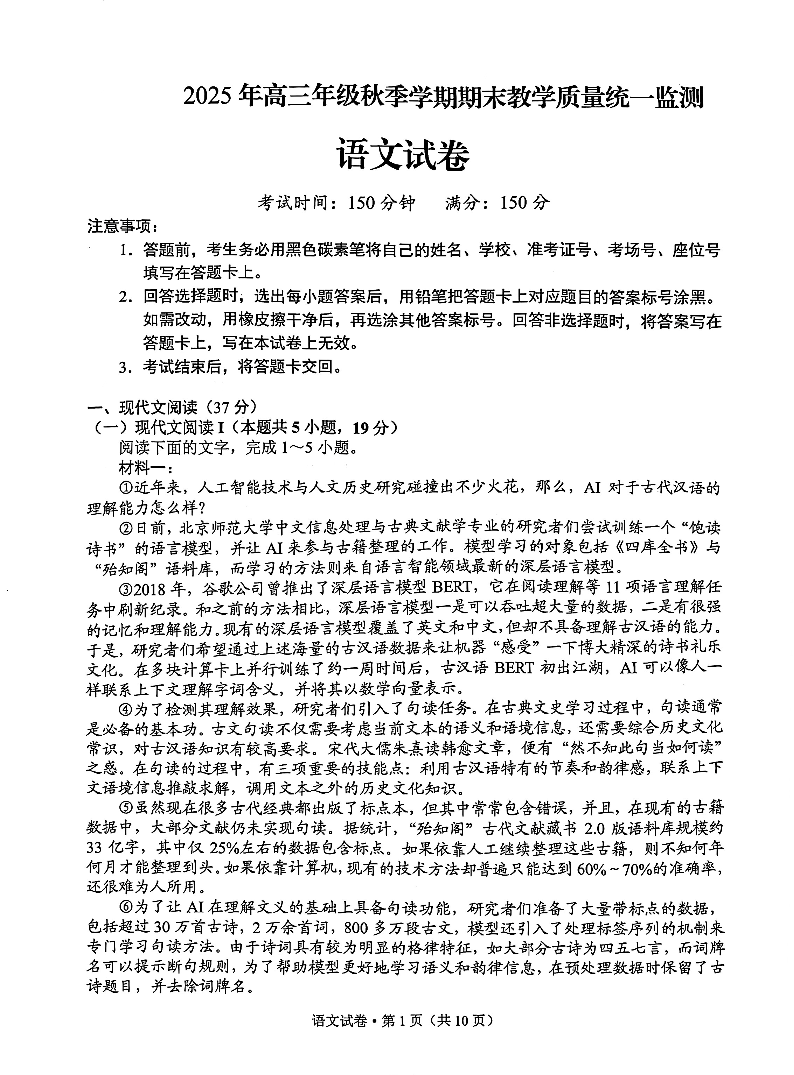 云南德宏傣族景颇族自治州2025年高三年级秋季学期期末教学质量统一监测 语文.pdf