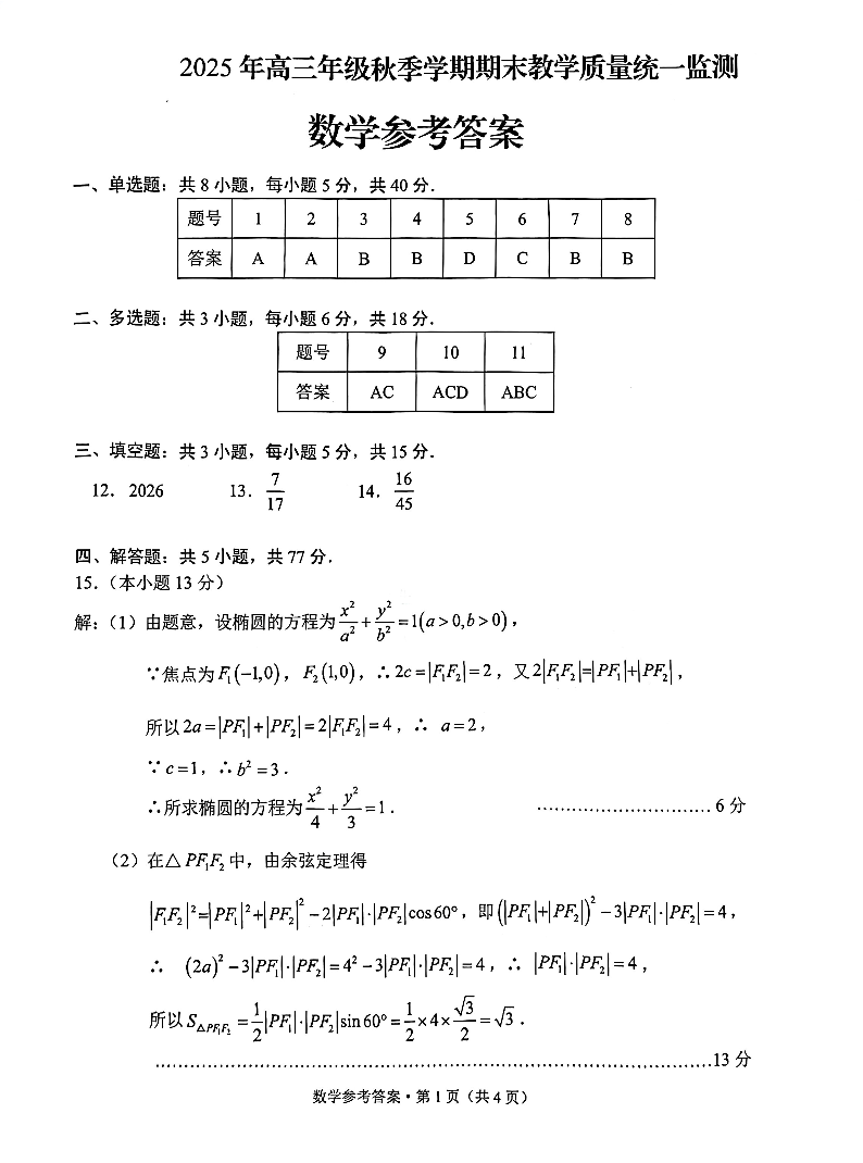 云南德宏傣族景颇族自治州2025年高三年级秋季学期期末教学质量统一监测 数学答案.pdf