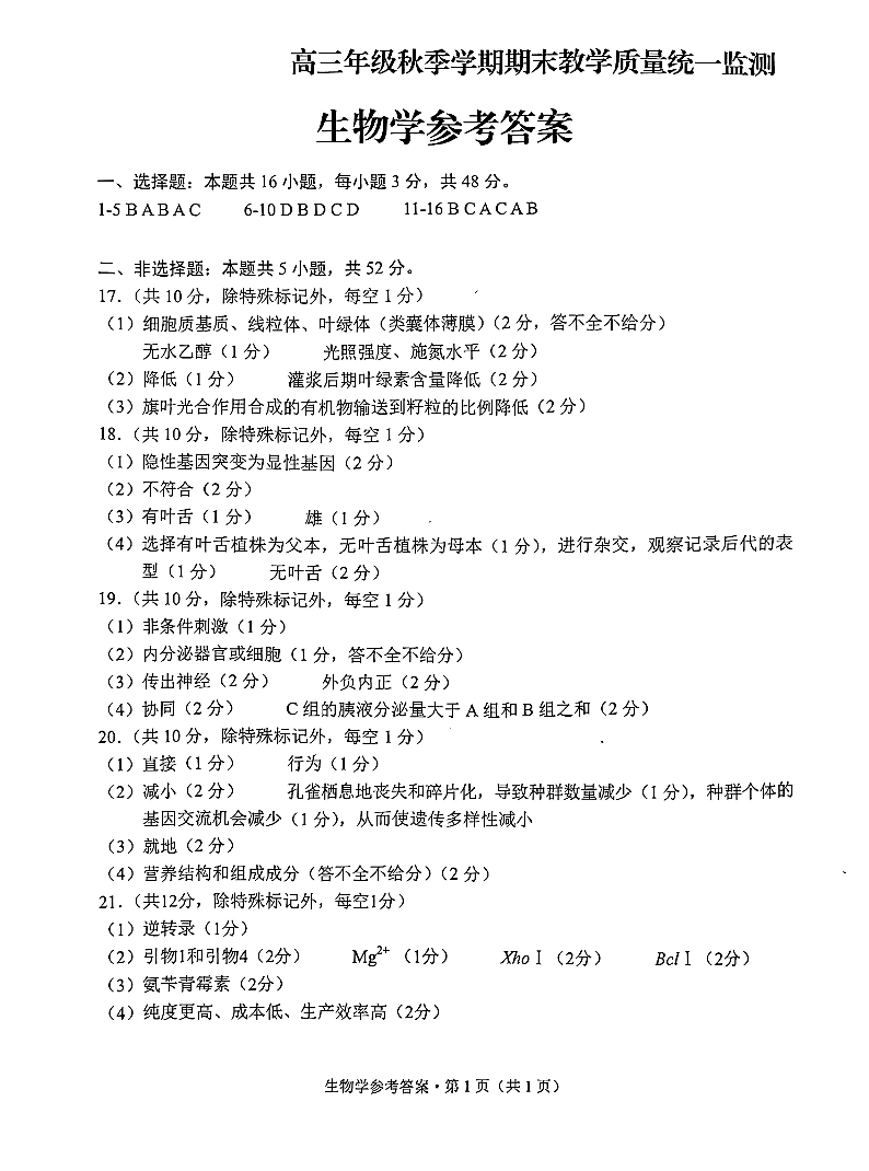 云南德宏傣族景颇族自治州2025年高三年级秋季学期期末教学质量统一监测 生物答案.pdf