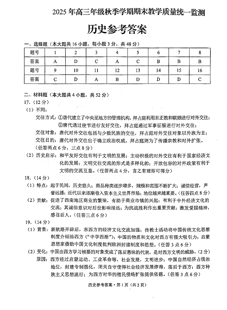 云南德宏傣族景颇族自治州2025年高三年级秋季学期期末教学质量统一监测 历史答案.pdf