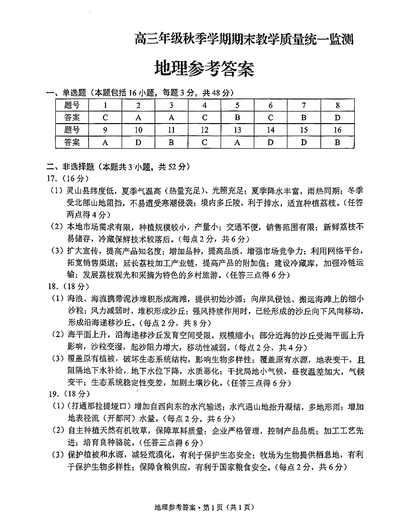 云南德宏傣族景颇族自治州2025年高三年级秋季学期期末教学质量统一监测 地理答案.pdf