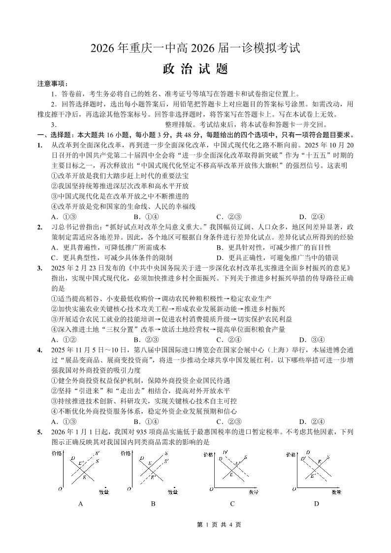 重庆一中高2026届一诊模拟考试 政治.pdf