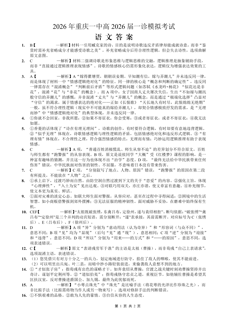 重庆一中高2026届一诊模拟考试 语文答案.pdf