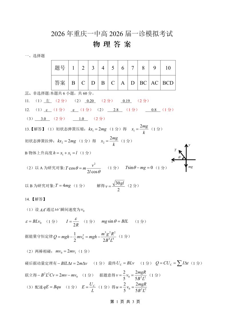 重庆一中高2026届一诊模拟考试 物理答案.pdf