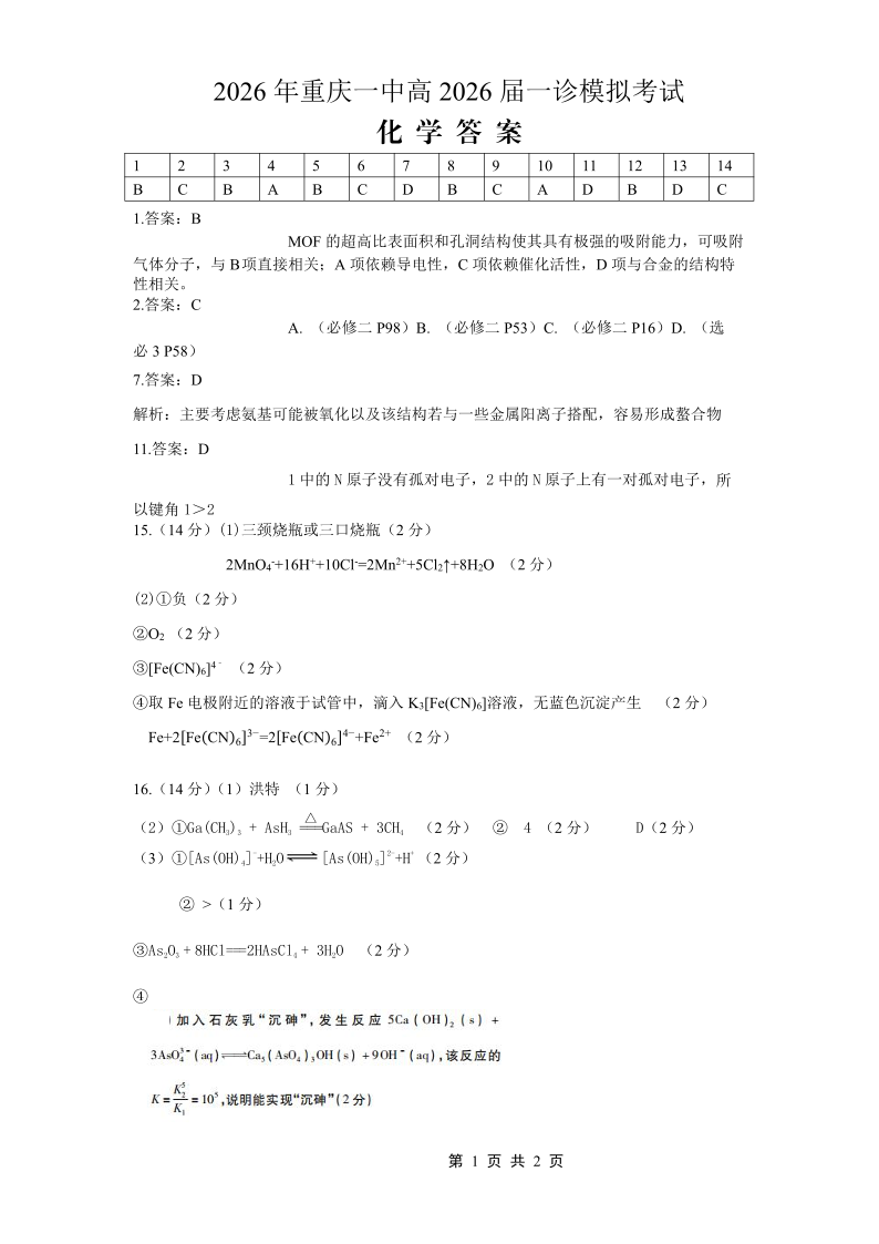 重庆一中高2026届一诊模拟考试 化学答案.pdf