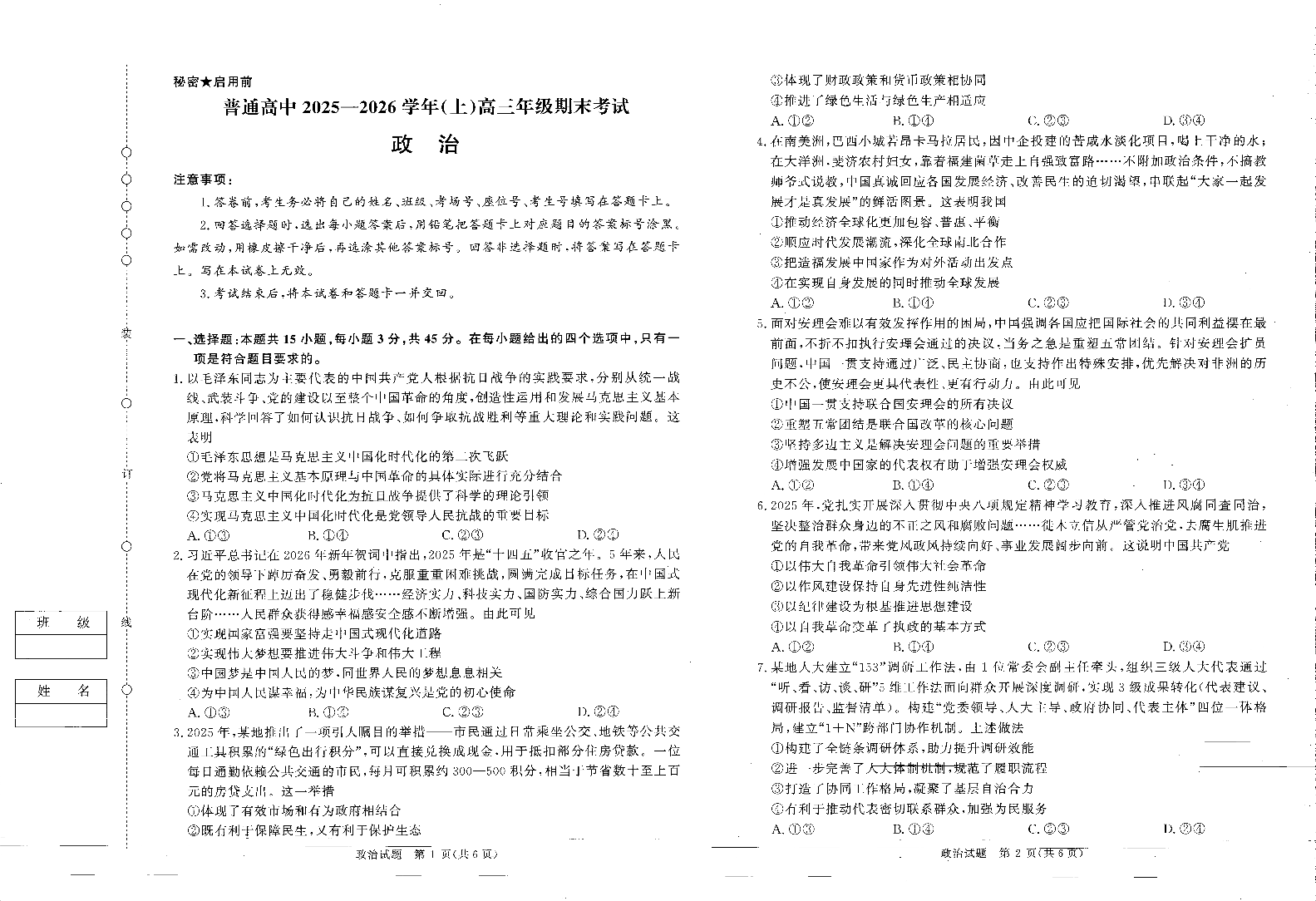 普通高中2025-2026学年(上)高三年级期末考试 政治.pdf