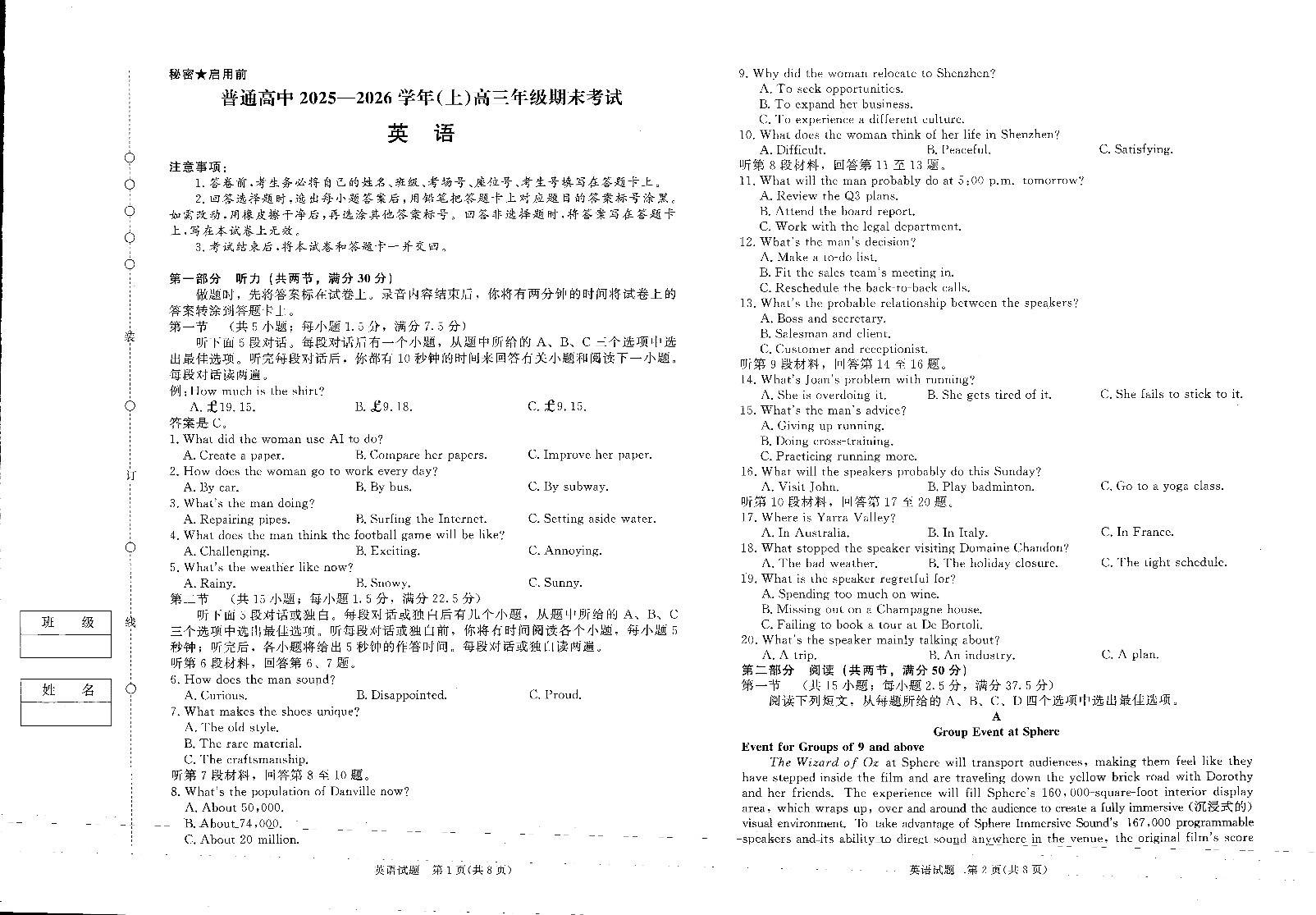 普通高中2025-2026学年(上)高三年级期末考试 英语.pdf