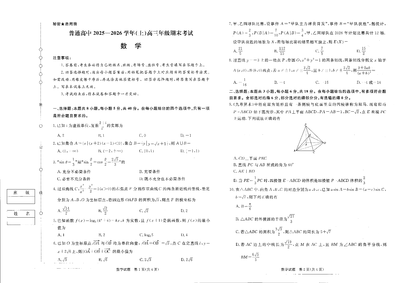 普通高中2025-2026学年(上)高三年级期末考试 数学.pdf