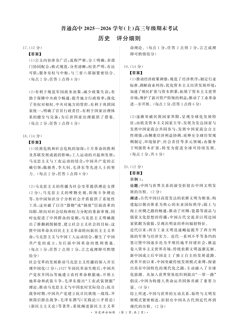 普通高中2025-2026学年(上)高三年级期末考试 历史评分细则.pdf