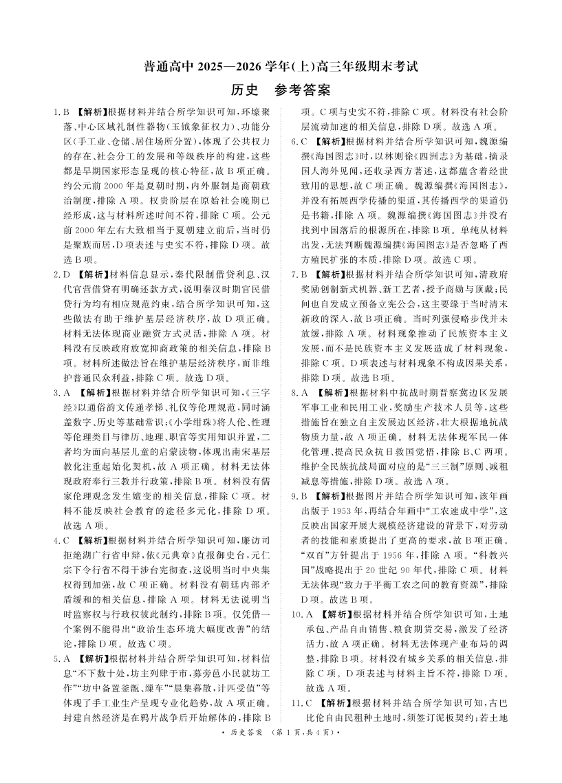 普通高中2025-2026学年(上)高三年级期末考试 历史答案.pdf