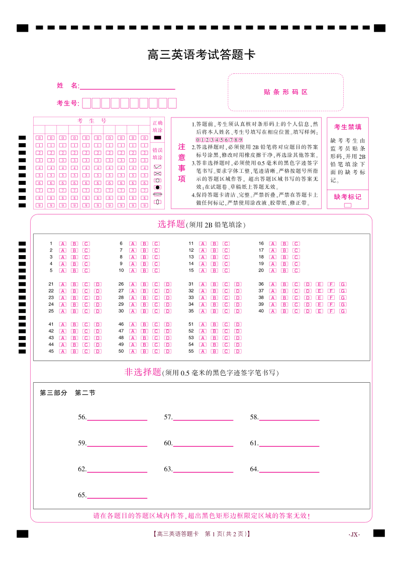 江西省2026届高三上学期1月百万大联考 英语答题卡.pdf