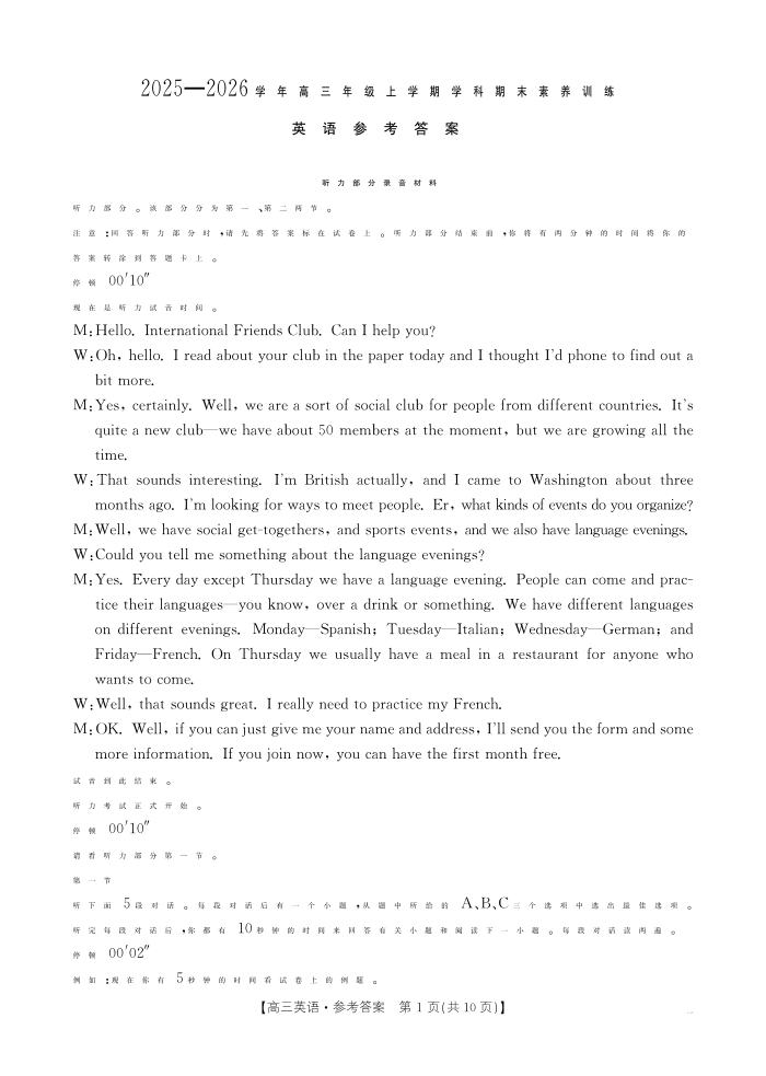 江西省2025-2026学年高三年级上学期学科期末素养训练 英语答案.pdf