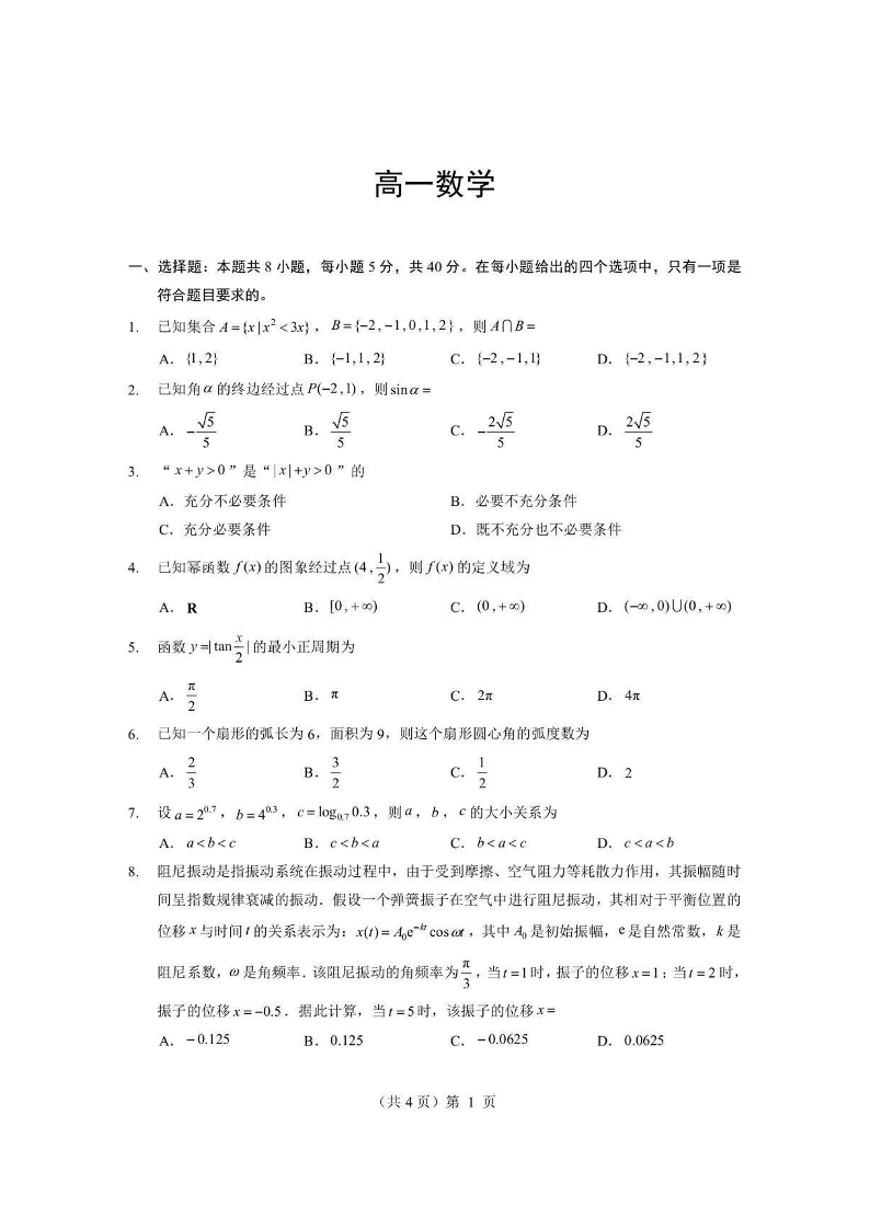 孝感市楚天协作体2025-2026学年度上学期高一年级期末考试 数学试题(含答案).pdf