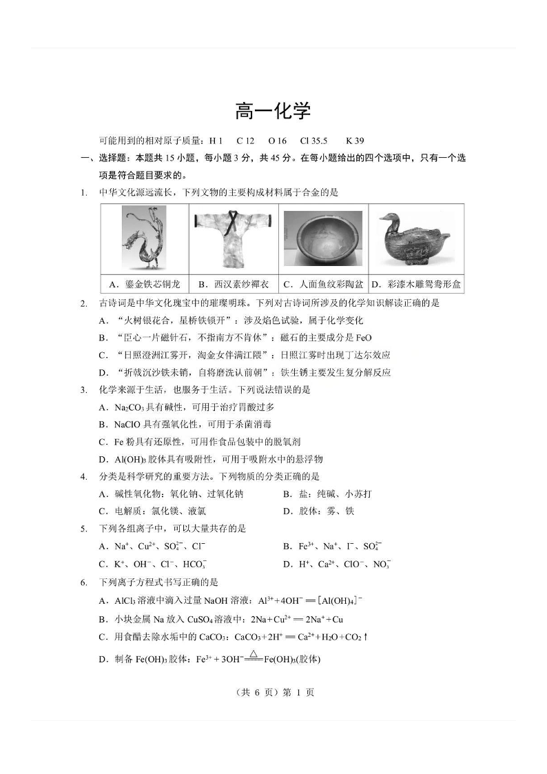 孝感市楚天协作体2025-2026学年度上学期高一年级期末考试 化学试题(含答案).pdf