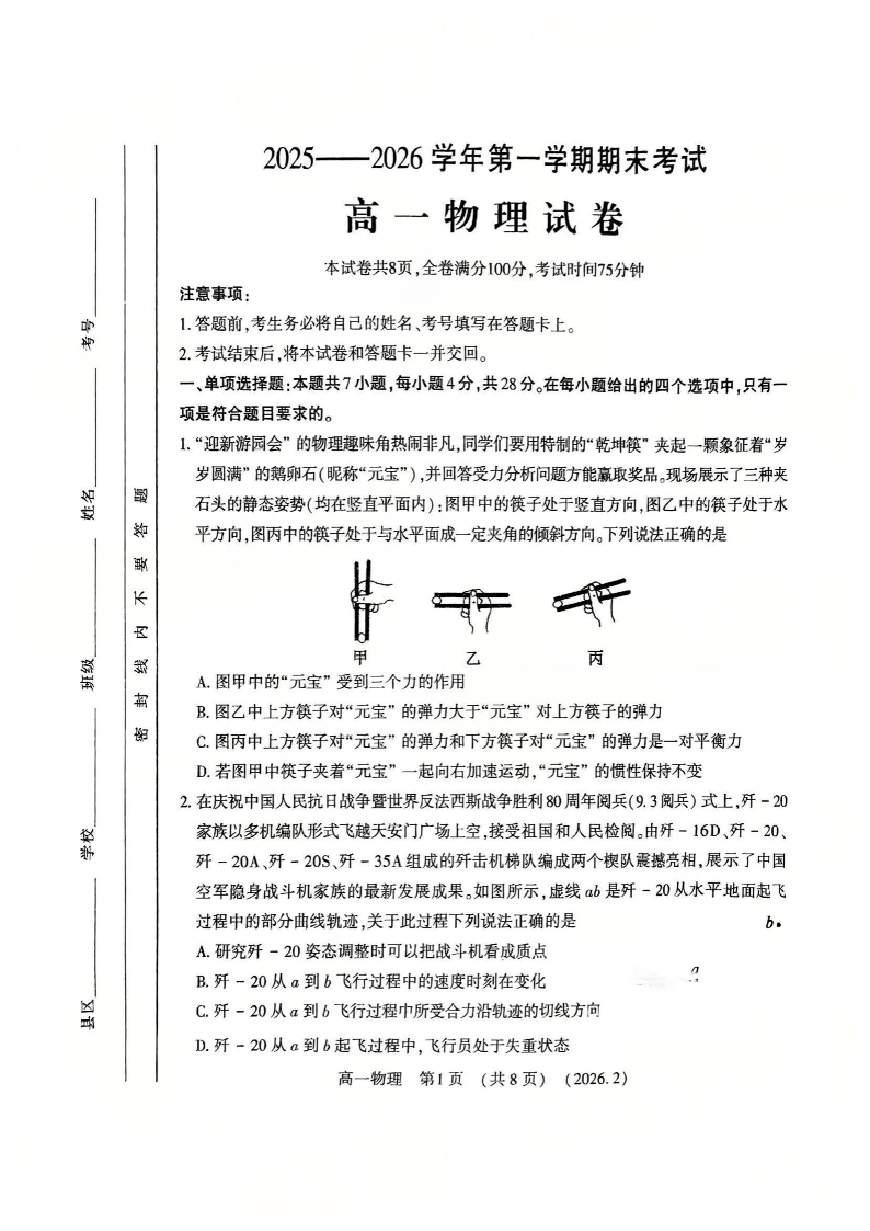 洛阳市2025-2026学年第一学期高一年级上学期期末考试 物理试题(含答案).pdf