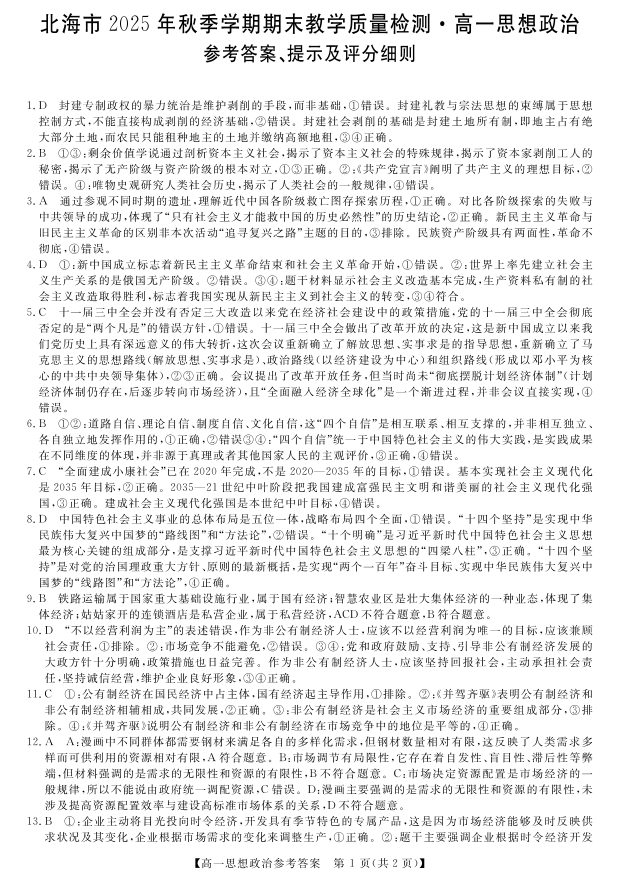 北海市2025年秋季学期高一年级期末教学质量检测 政治答案.pdf
