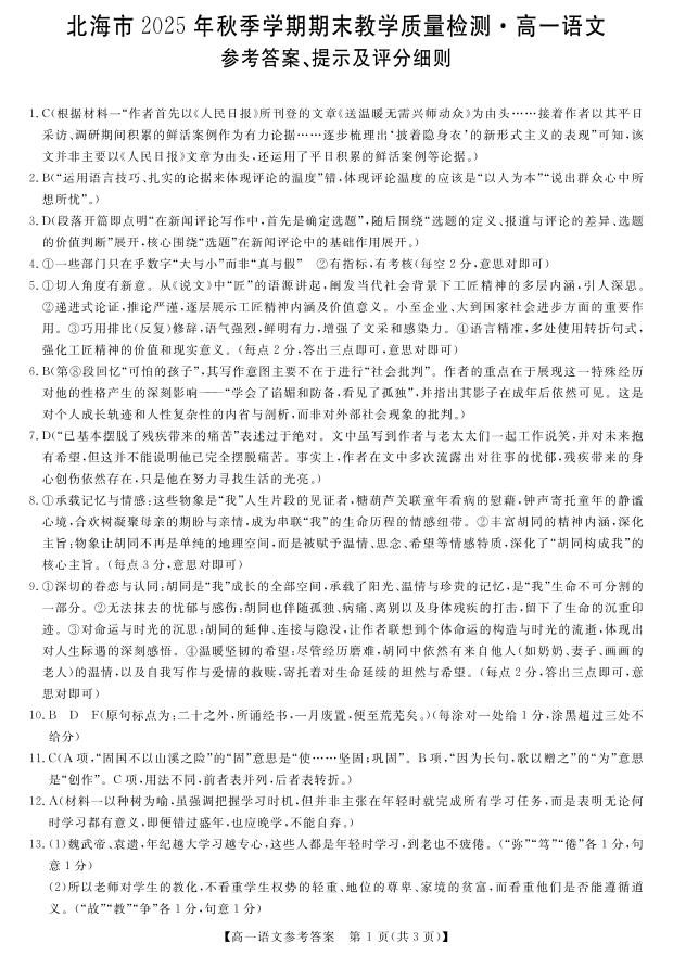 北海市2025年秋季学期高一年级期末教学质量检测 语文答案.pdf