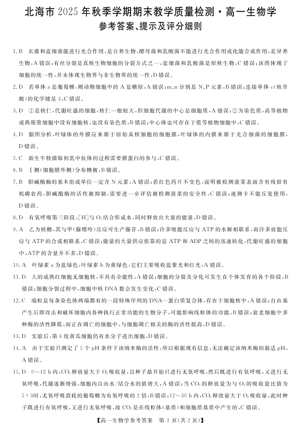北海市2025年秋季学期高一年级期末教学质量检测 生物答案.pdf