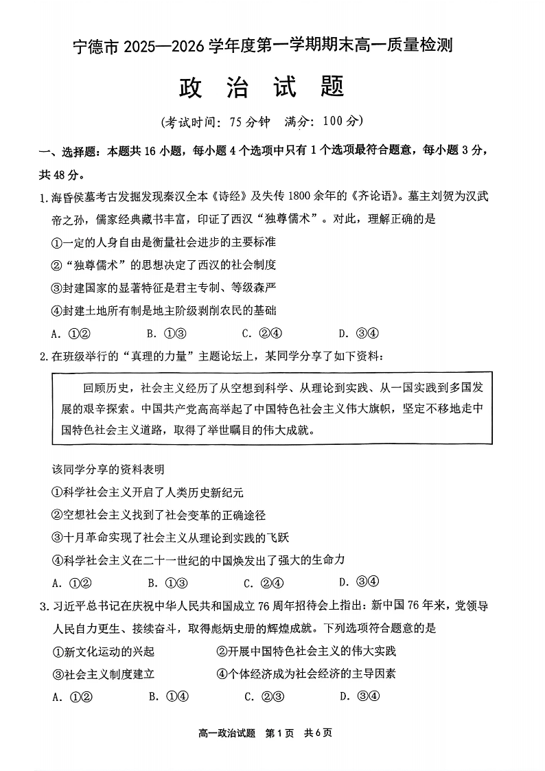 宁德市2025-2026学年度第一学期期末高一年级质量检测 政治.pdf