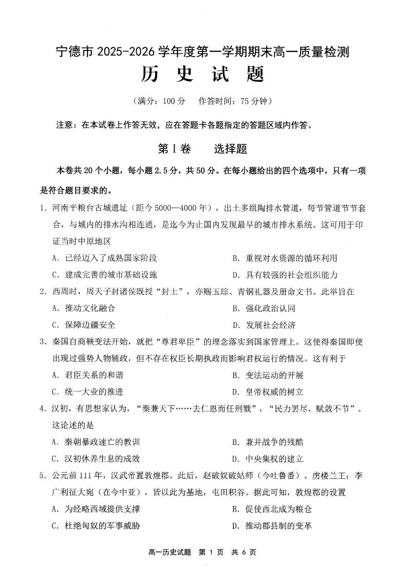 宁德市2025-2026学年度第一学期期末高一年级质量检测 历史.pdf