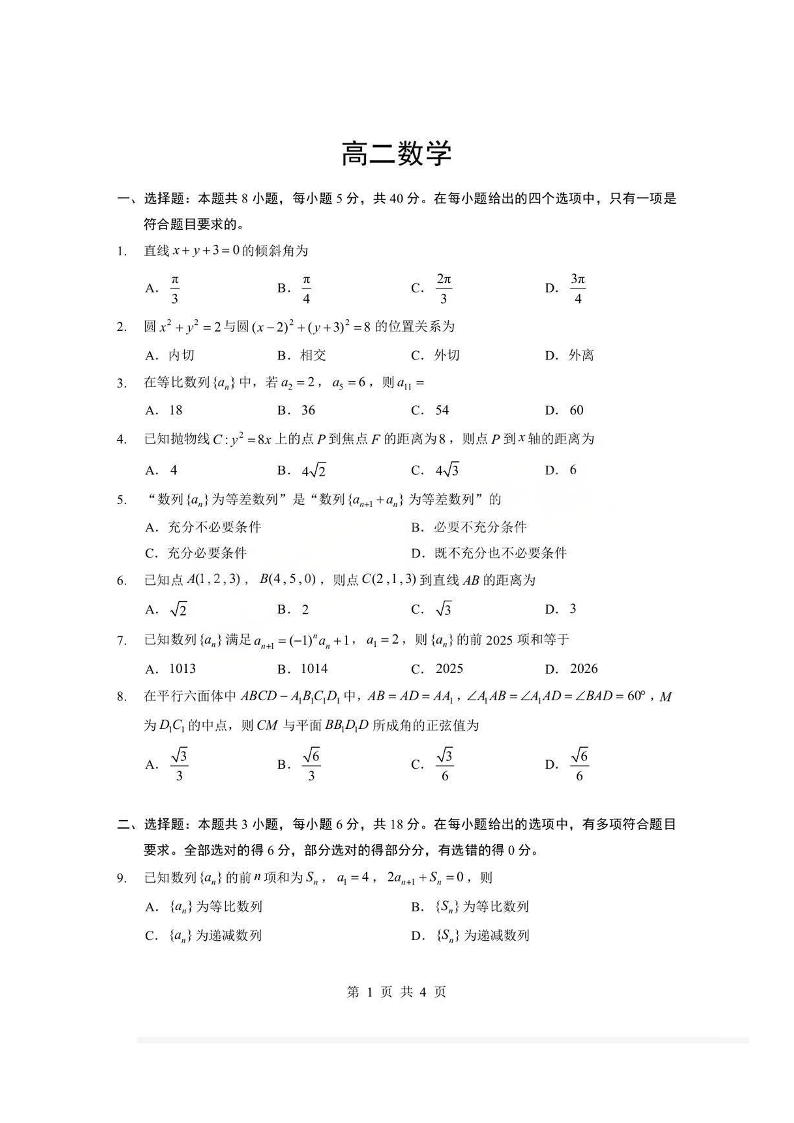 孝感市楚天协作体2025-2026学年度上学期高二年级期末考试 数学(A卷)试题(含答案).pdf