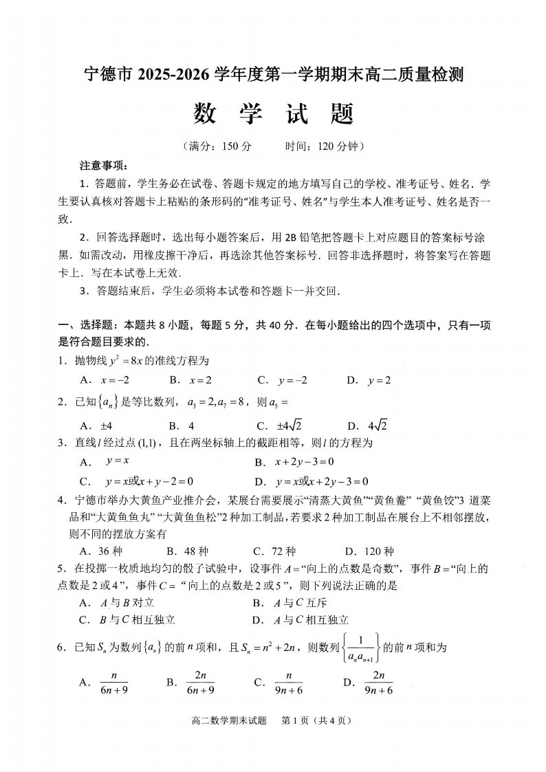 宁德市2025-2026学年度第一学期期末高二质量检测 数学.pdf