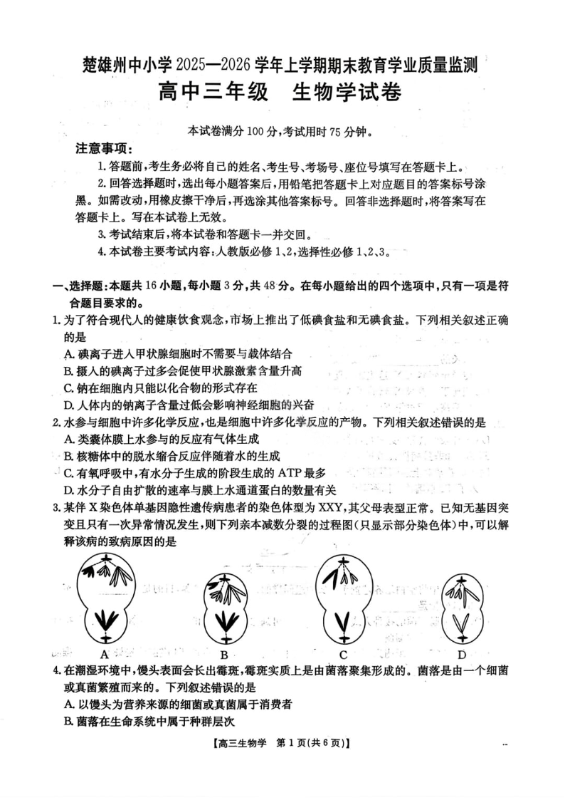 楚雄州2025-2026学年上学期高三期末教育学业质量监测 生物试题(含答案).pdf