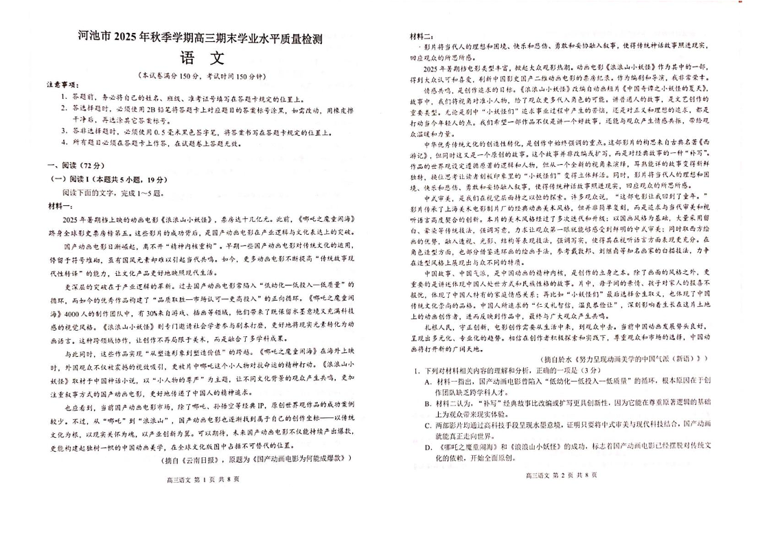 河池市2025年秋季学期高三期末学业水平质量检测 语文.pdf
