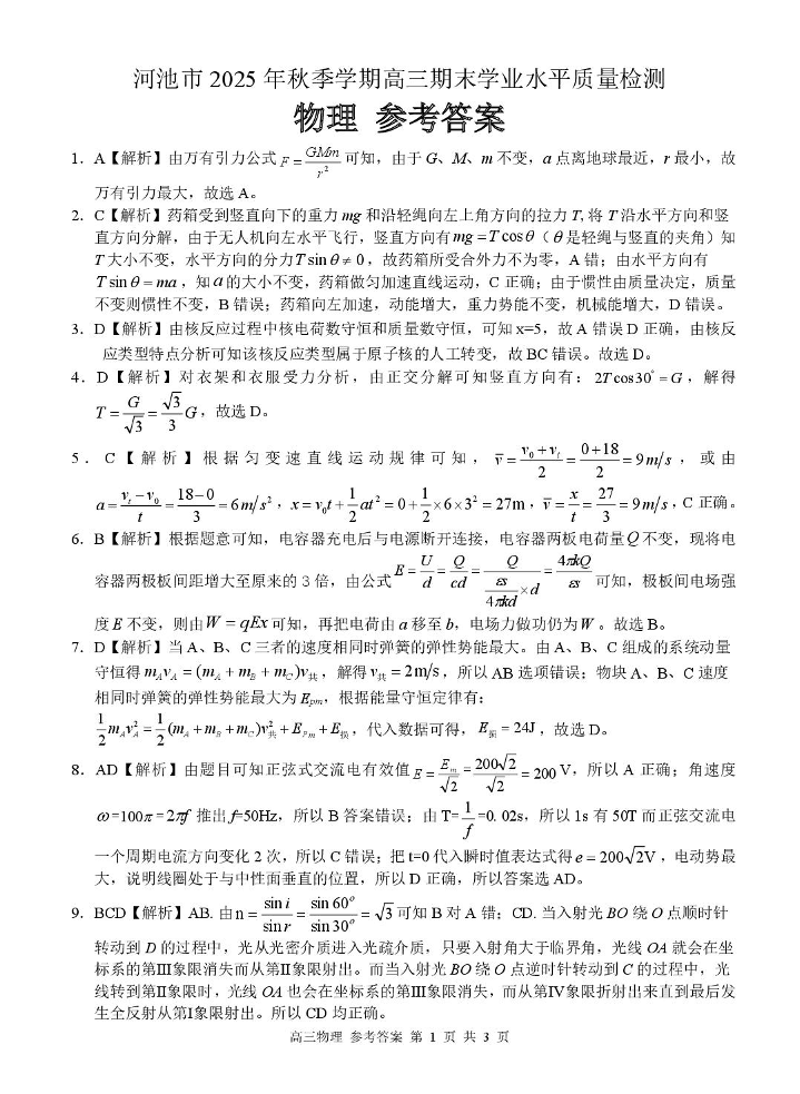 河池市2025年秋季学期高三期末学业水平质量检测 物理答案.pdf