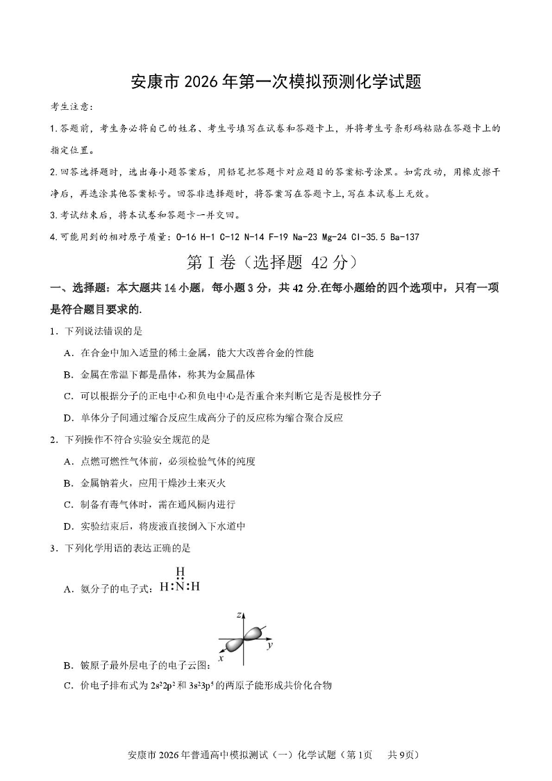 安康市2026年高三年级第一次模拟预测 化学试题(含答案).pdf