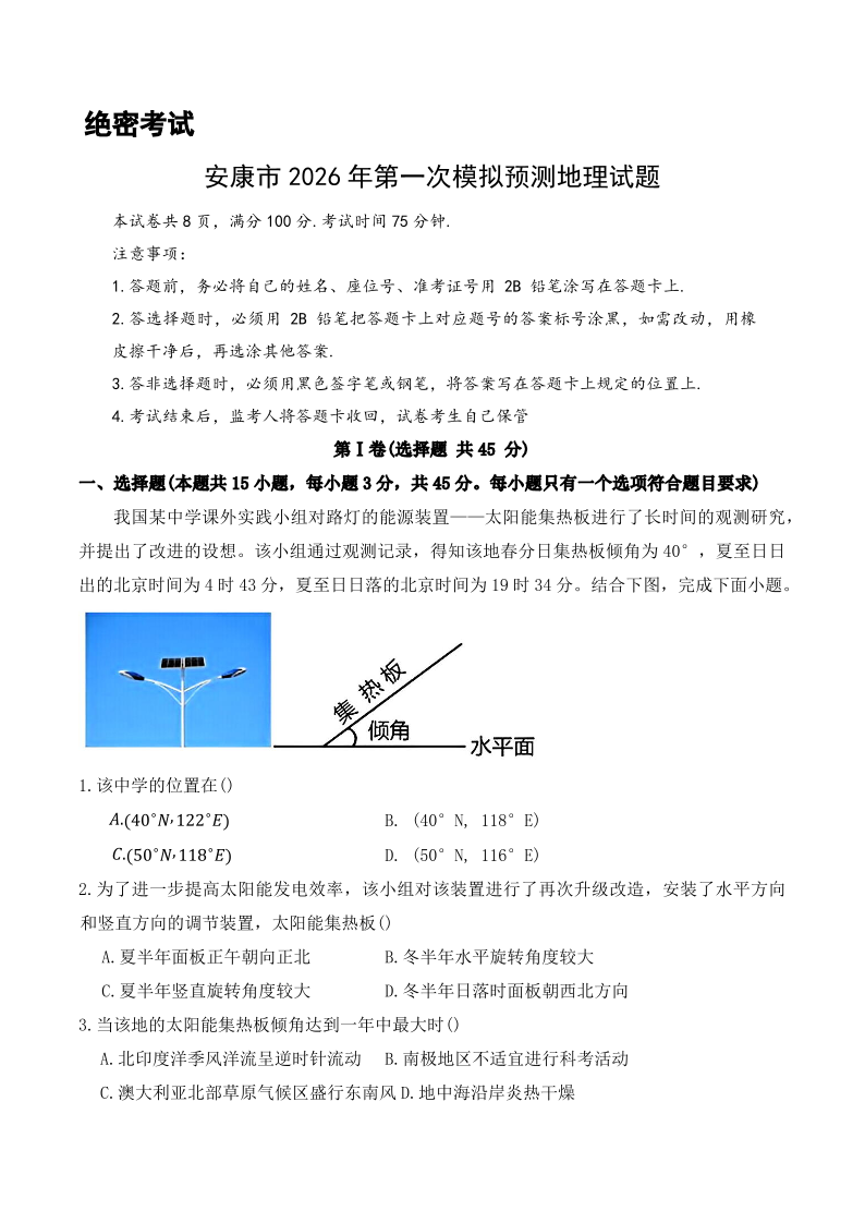 安康市2026年高三年级第一次模拟预测 地理试题(含答案).pdf
