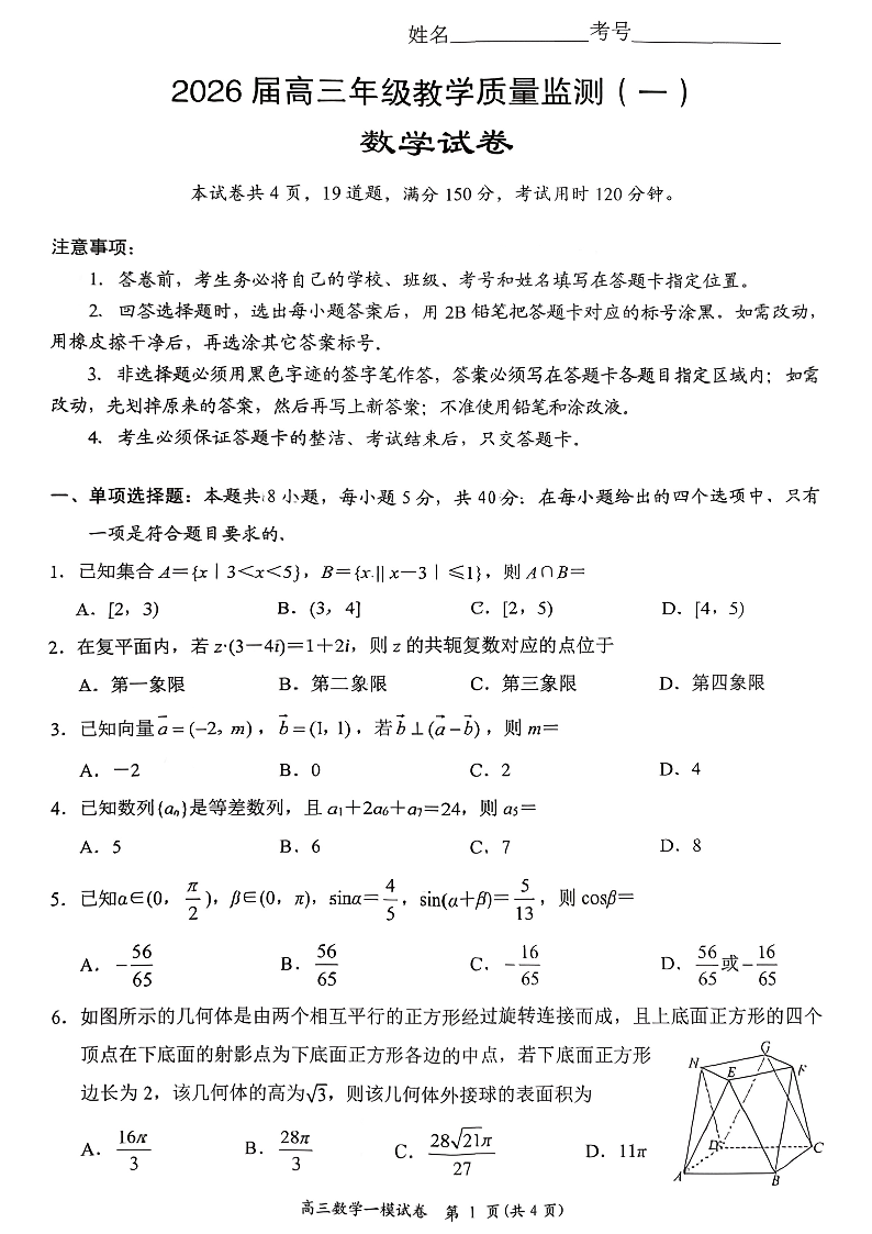 岳阳市2026届高三年级教学质量监测(一)数学.pdf