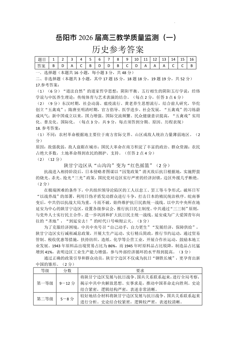 岳阳市2026届高三年级教学质量监测(一)历史答案.pdf