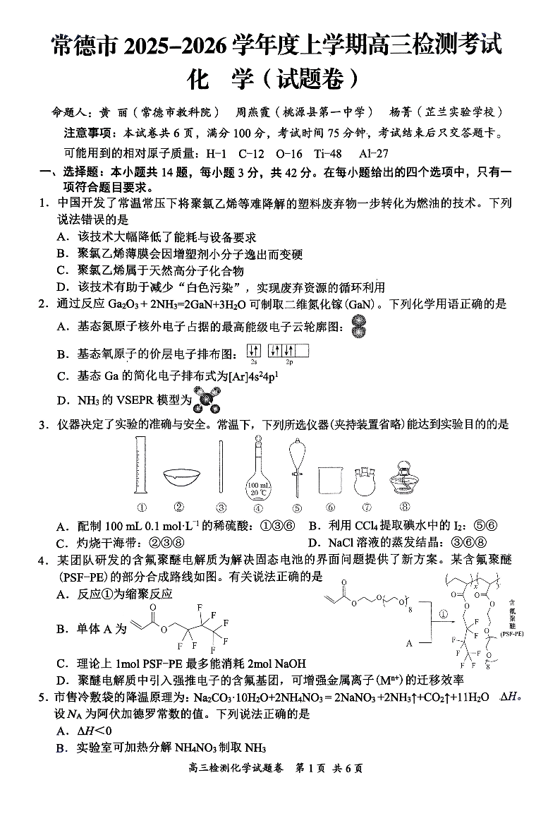 湖南省益阳市、常德市2025-2026学年度上学期高三年级检测考试 化学试题(含答案).pdf