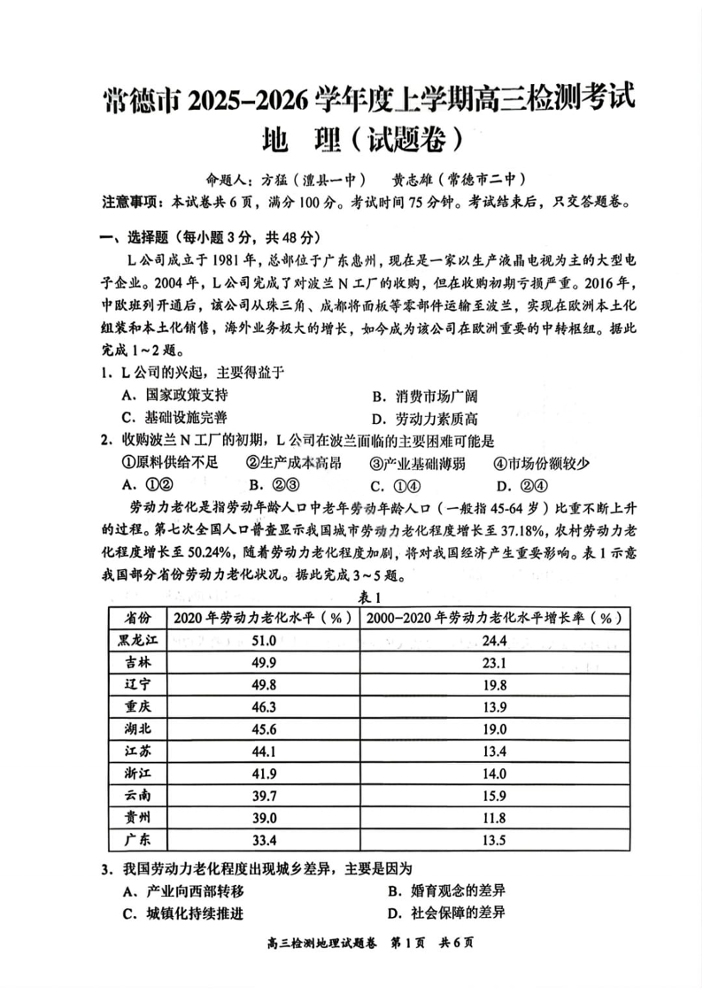 湖南省益阳市、常德市2025-2026学年度上学期高三年级检测考试 地理试题(含答案).pdf