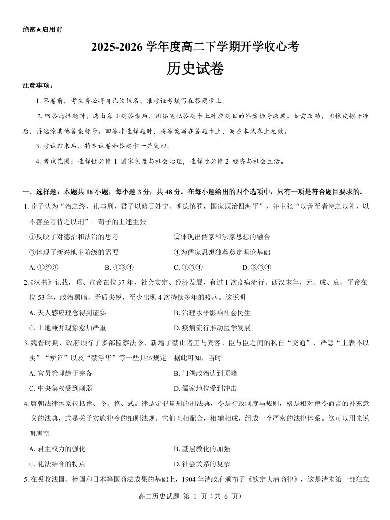 2025-2026学年度高二下学期开学收心考 历史试题.docx
