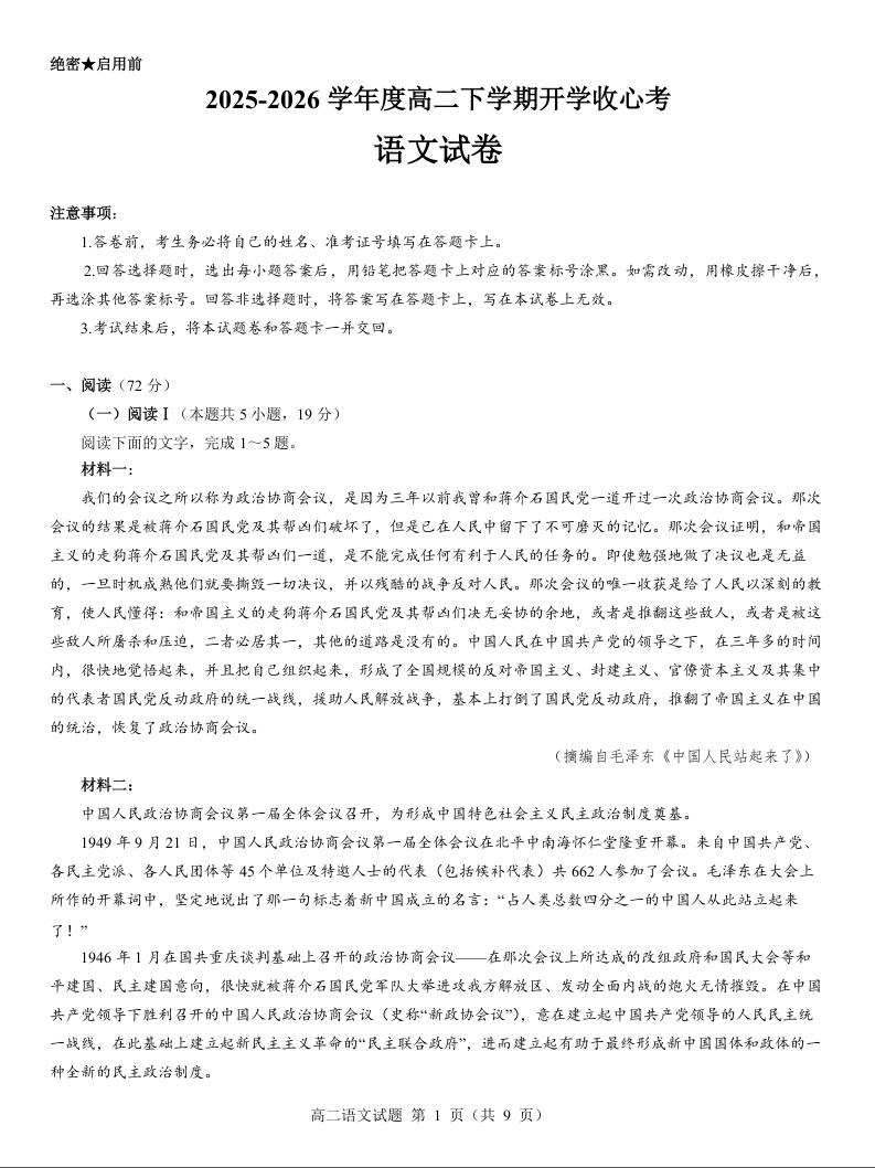 1 2025-2026学年度高二下学期开学收心考 语文.docx
