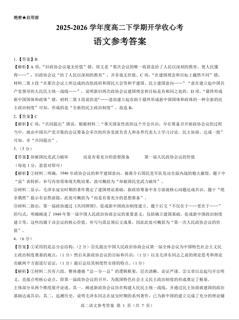 1 2025-2026学年度高二下学期开学收心考 语文参考答案.docx
