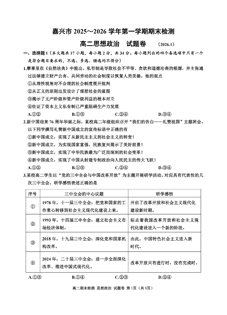 嘉兴市2025~2026学年高二年级第一学期期末检测测试 政治.pdf