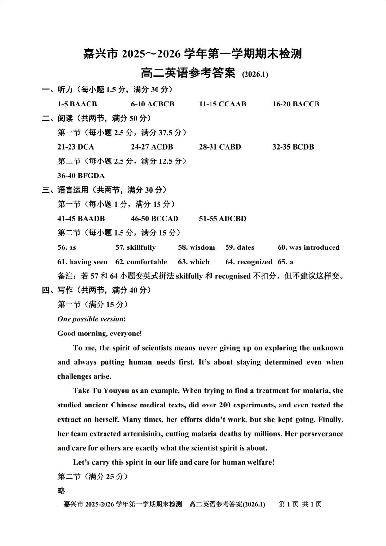 嘉兴市2025~2026学年高二年级第一学期期末检测测试 英语答案.pdf