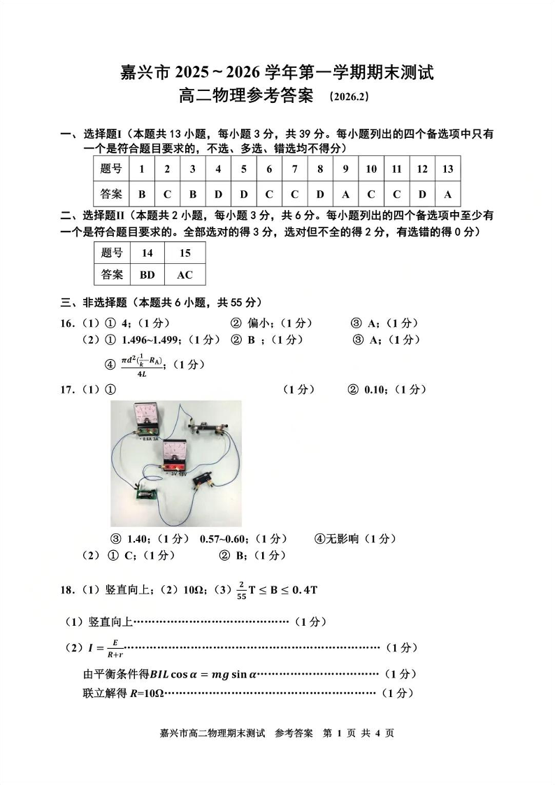 嘉兴市2025~2026学年高二年级第一学期期末检测测试 物理答案.pdf