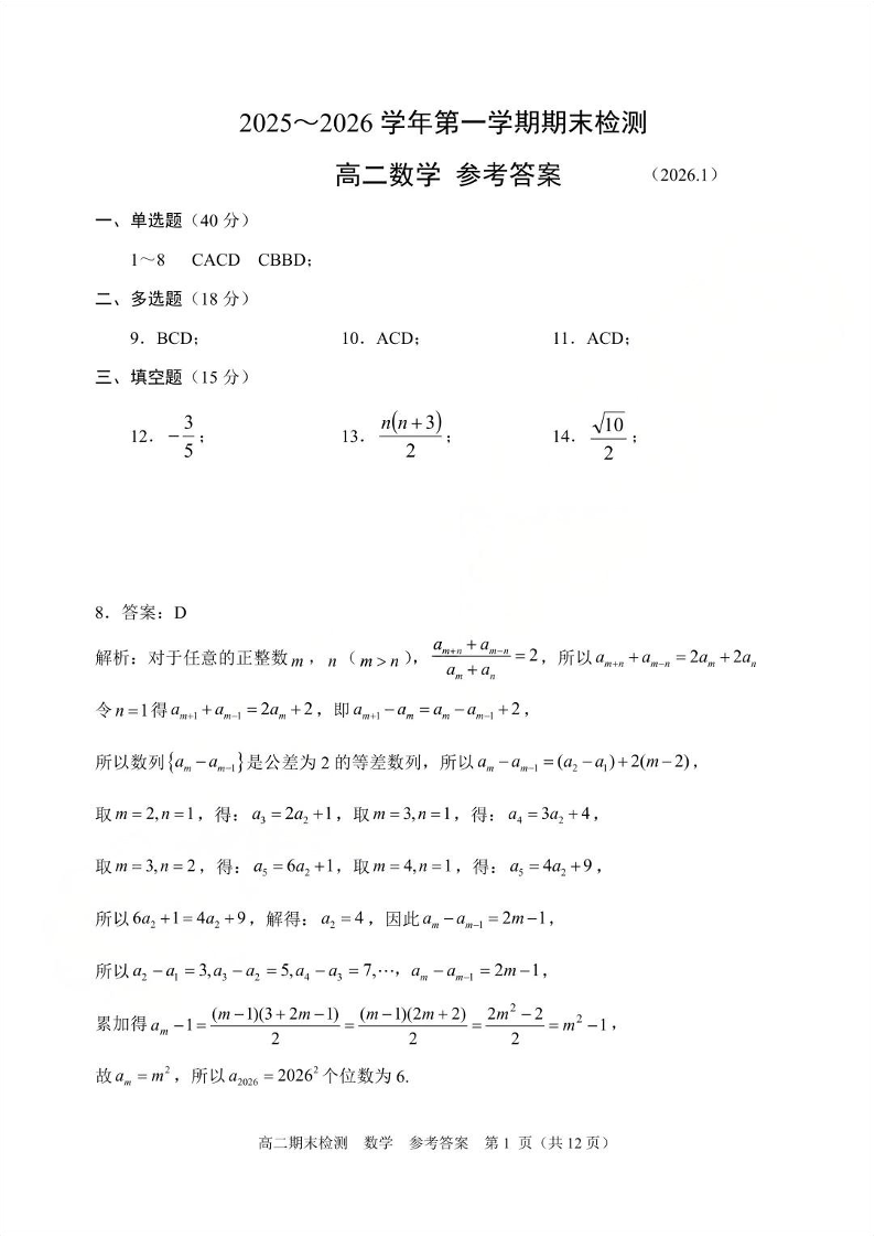嘉兴市2025~2026学年高二年级第一学期期末检测测试 数学答案.pdf